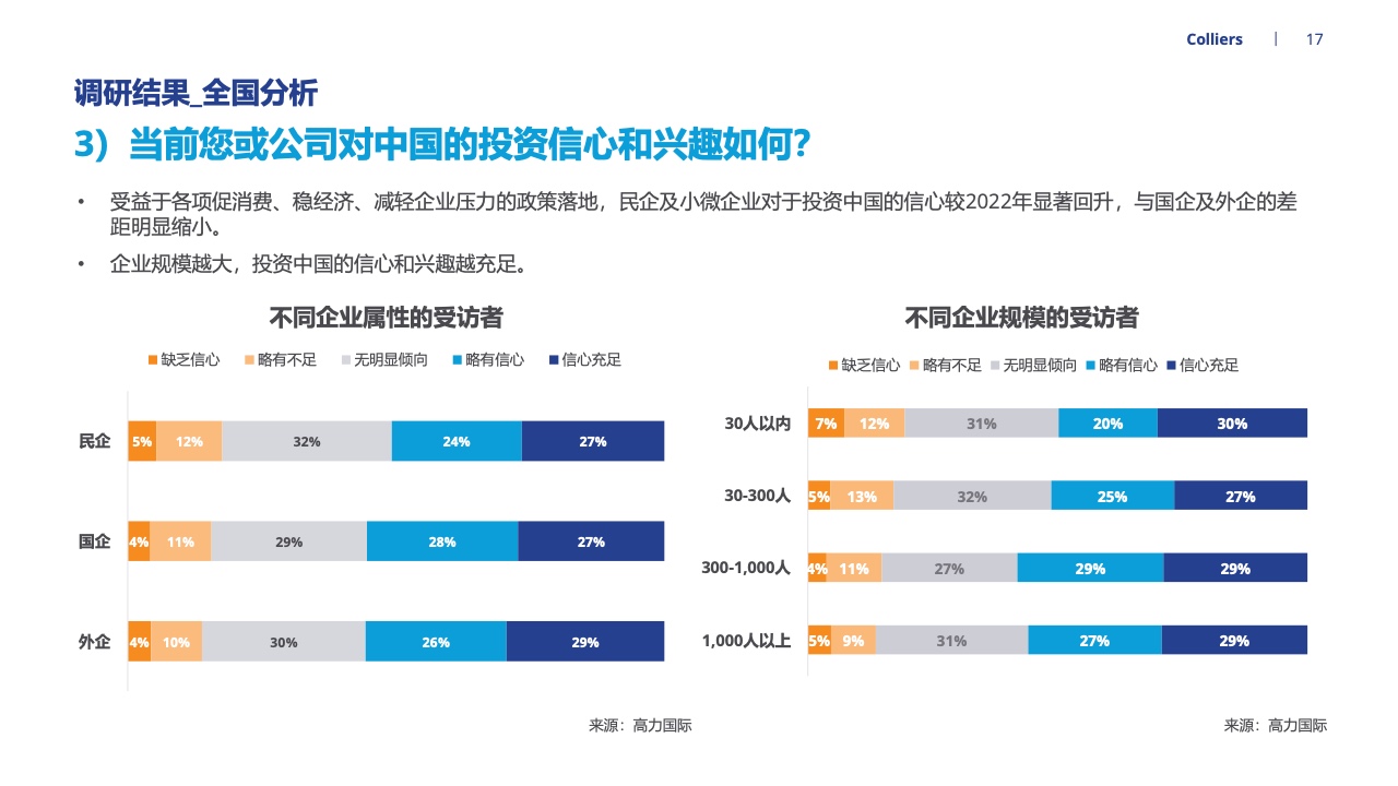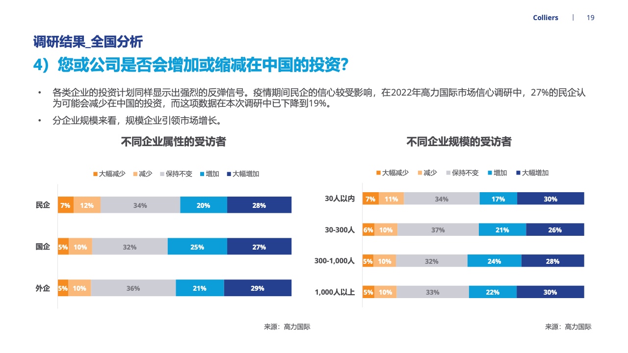 其中,过半的投资方表示会增加对华投资,且超过三成表示会大幅增加投资;各类企业的投资计划同样显示出强烈的反弹信号,特别是民企的投资意愿相较2022年提升明显。