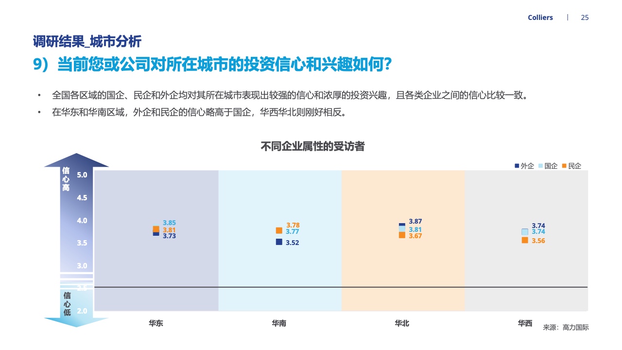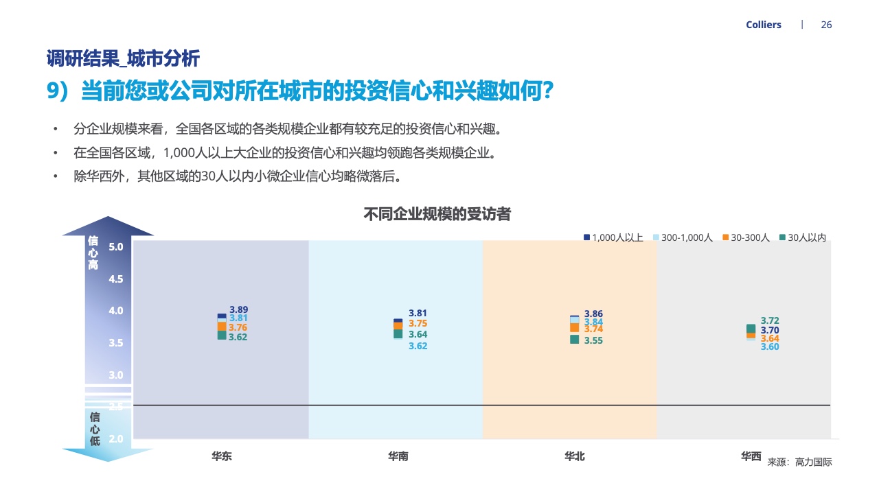 从投资信心的平均分来看,华东和华北的整体投资兴趣较高。华北城市间的投资信心分化较明显,北京较领先于其他城市。华西的新一线城市成都、西安信心较高,投资兴趣较为浓厚。