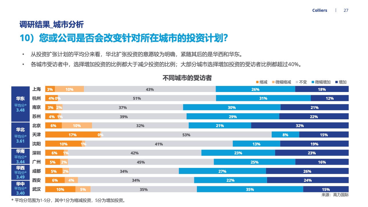 从投资扩张计划的平均分来看,华北扩张投资的意愿较为明确,紧随其后的是华西和华东。各城市受访者中,选择增加投资的比例都大于减少投资的比例;大部分城市选择增加投资的比例都超过40%。