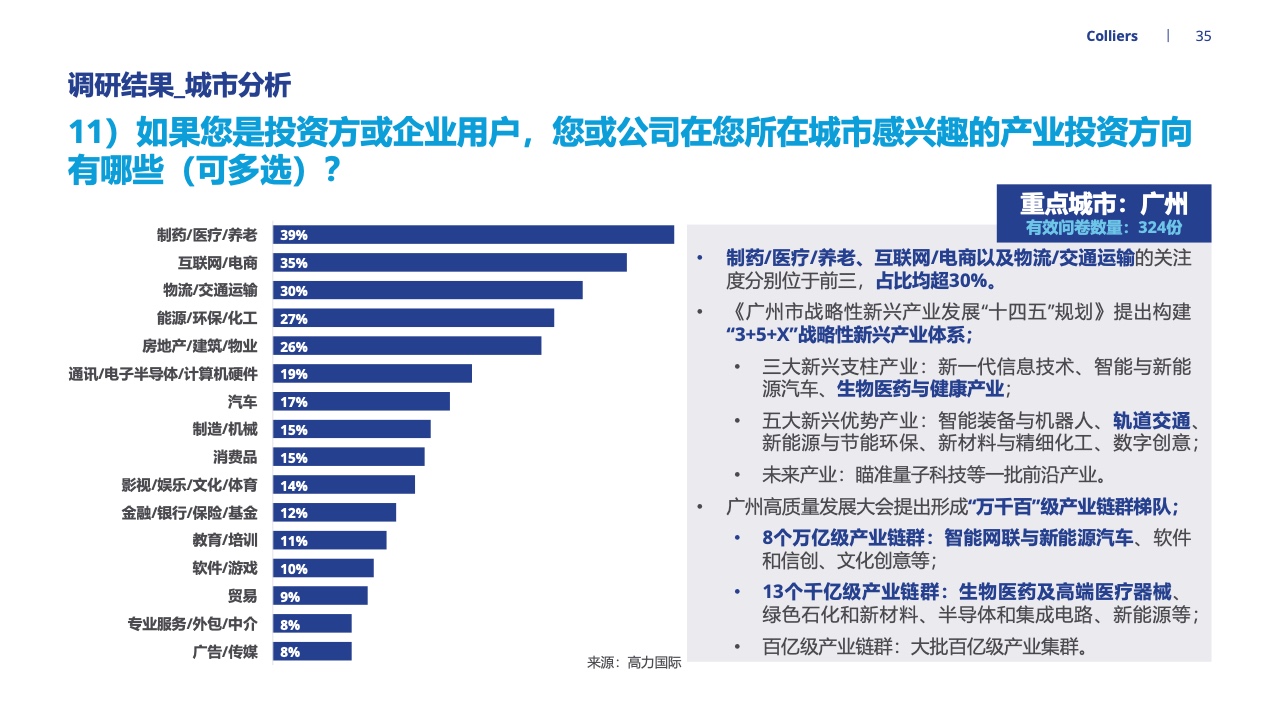 受关注的行业热点集中,各城市的产业方向选择同质化也较高。制药/医疗/养老位列受关注榜首位,展示了投资方和企业对医养产业的关注以及未来布局的可能;能源/环保/化工和互联网/电商也受到高度关注,对比2022年调研结果有明显提升。