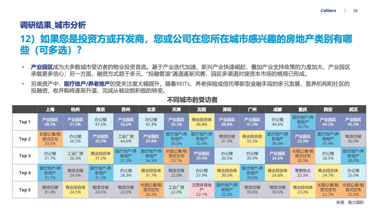 产业园区成为大多数城市受访者的物业投资首选。基于产业迭代加速、新兴产业快速崛起,叠加产业支持政策的力度加大,产业园区承载更多信心;另一方面,融资方式趋于多元,“投融管退”通道逐渐完善,园区多渠道对接资本市场的格局已形成。