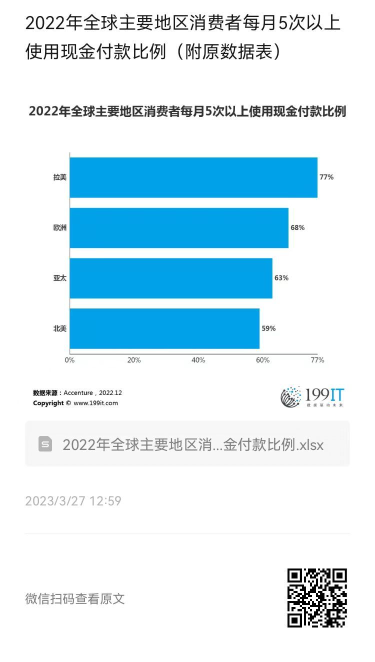 2022年全球主要地区消费者每月5次以上使用现金付款比例(附原数据表) ​​​