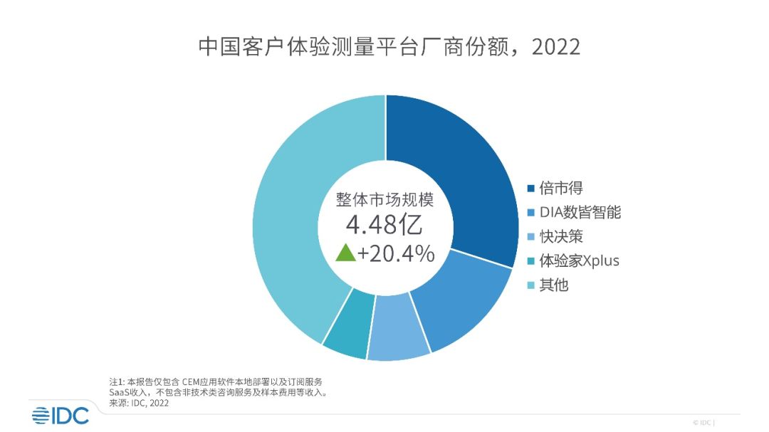 报告显示,2022 年中国客户体验测量平台技术市场总体规模为 4.48 亿元人民币。报告列出了主要供应商的市场份额,分析了中国客户体验测量平台的竞争态势,并对领先厂商在 2022 年的市场表现给予了分析评价,可供企业和组织的客户体验管理部门和组织机构在选择客户体验测量平台供应商时进行参考。