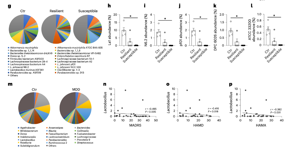 为了证实这个发现的转化意义,他们接着分析了与CSDS小鼠模型相关的重度抑郁障碍(MDD)患者的肠道菌群。结果显示,这些患者的乳酸菌含量与MDD各种评分均呈负相关,也就是说MDD评分越高,肠道乳酸菌含量越低。