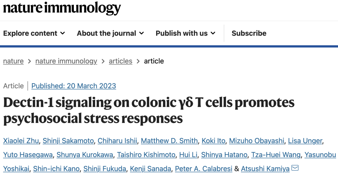 [5]. Zhu X, Sakamoto S, Ishii C, et al. Dectin-1 signaling on colonic γδ T cells promotes psychosocial stress responses [published online ahead of print, 2023 Mar 20]. Nat Immunol. 2023;10.1038/s41590-023-01447-8. doi:10.1038/s41590-023-01447-8