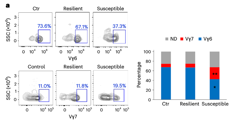 由于硬脑膜固有的γδT细胞通常表达Vγ6,而肠道γδT细胞则表达Vγ7。因此,可以通过流式细胞术来区分CSDS之后硬脑膜处的γδT细胞是从哪里来的。