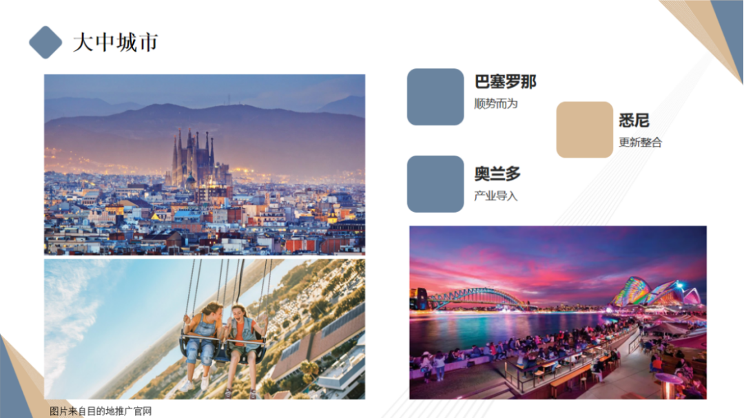 城市规模不同,其旅游休闲发展模式和路径也有所不同。考虑到城市的地域分布、依托的基础资源类型及典型性等,课题组选取巴塞罗那、奥兰多和悉尼作为大中型城市代表,坎昆、里米尼和乌布作为小城镇代表。