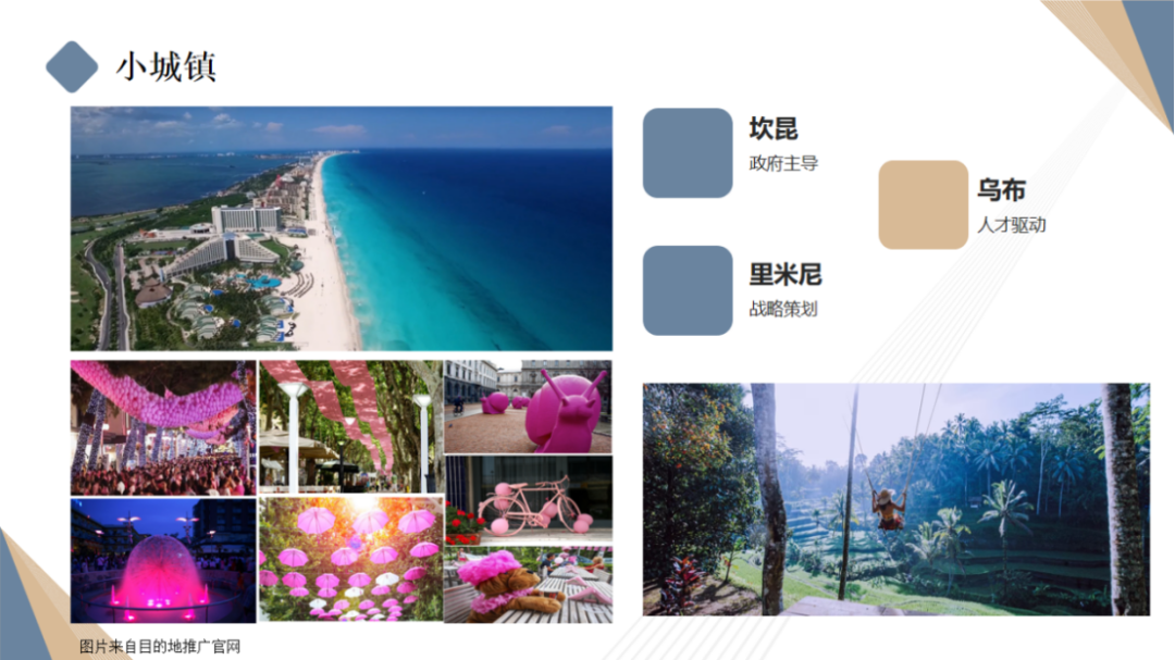 坎昆从一个小渔村经过三四十年,快速发展为一个世界知名的旅游城市,是政府主导城市旅游发展的全球典范。里米尼是意大利的海滨城市,夜间休闲娱乐生活丰富,为改善夜间娱乐生活的“享乐主义”认知,里米尼在2006年推出了“粉色之夜”节事。节事期间,政府和文化团体用粉色装饰街道和城市设施,居民自发地用粉色装扮自己的商店或住所,游客也积极用粉色装扮自己,这也使其成为利益相关者通力合作(Co-performing)的典型案例。