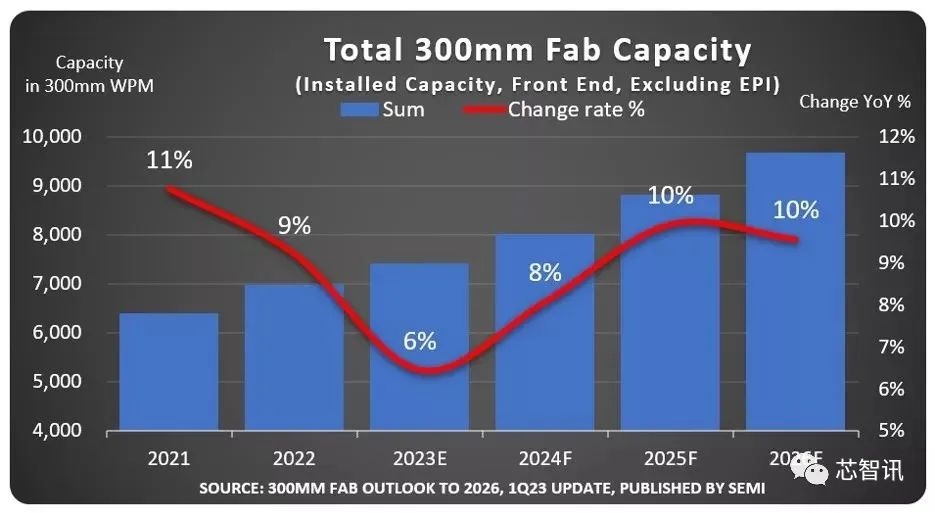 SEMI表示,全球12吋晶圆厂产能分别于2021年及2022年强劲成长11%及9%,2023年因存储芯片及逻辑元件需求疲软影响,成长可能趋缓,增幅将降至6%。