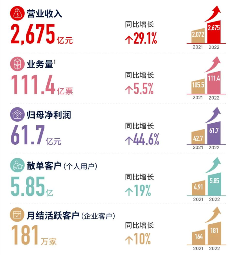 从年报获悉,顺丰 2022 年的业务量 111.4 亿票,同比增长 5.5%;个人用户 5.85 亿,同比增长 19%;月结活跃客户 181 万家,同比增长 10%。