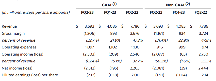 GAAP 净亏损 23.1 亿美元(当前约 158.93 亿元人民币),即每股摊薄 2.12 美元,而去年同期利润为 22.6 亿美元;非 GAAP 净亏损 20.8 亿美元,即每股摊薄 1.91 美元。查询获悉,这是美光过去二十年来最严重的季度亏损,上一次出现如此规模的季度亏损是 2003 财年第二财季,当时净亏损为 19.4 亿美元。