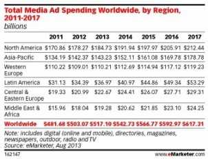 eMarketer预计,2013年全球媒体广告总支出预计增长2.8%;全球数字广告支出预计将达到1176亿美元,比2012年增长13%;而移动广告支出在数字广告及媒体广告支出中所占的比例虽然不大,但却增长迅猛,比2012年增长79.7%。