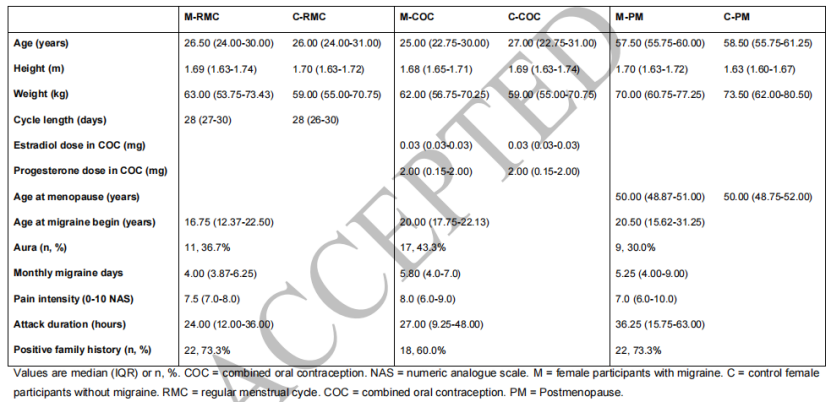首先,经过严格的筛选,该项研究由个人背景特征相似的180名(每组30名)女性完成。作为一项有代表性的匹配队列研究,该研究队列包括三组EM(发作性偏头痛)女性参与者,一组为月经周期正常(RMC,regular menstrual cycle)的EM参与者(M-RMC),一组为接受联合雌激素-孕酮口服避孕药(COC)避孕治疗的EM参与者(M-COC),还有一组为绝经后的EM参与者(M-PM)。对照组则为三组年龄匹配的非EM女性参与者(C-RMC、C-COC和C-PM)。并且三组EM参与者在偏头痛的频率和强度方面保持相似,选择年龄匹配的非EM参与者,也全部没有其他重大疾病或常规药物治疗。
