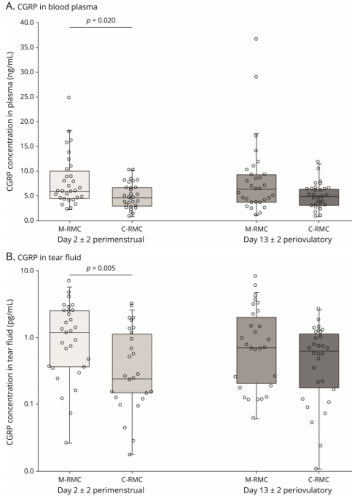 研究结果发现,在月经期间,具有正常月经周期的女性偏头痛参与者(M-RMC)血浆和泪液中的CGRP浓度均显著高于同样具有正常月经周期的没有偏头痛的女性参与者(C-RMC)。但在排卵期间,M-RMC组的CGRP水平虽然比C-RMC组更高,但未达到统计学意义。