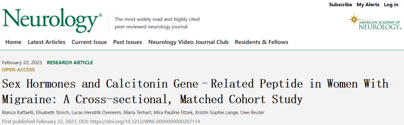 [5] Raffaelli, Bianca et al. “Sex Hormones and Calcitonin Gene-Related Peptide in Women With Migraine: A Cross-sectional, Matched Cohort Study.” Neurology, 10.1212/WNL.0000000000207114. 22 Feb. 2023, doi:10.1212/WNL.0000000000207114