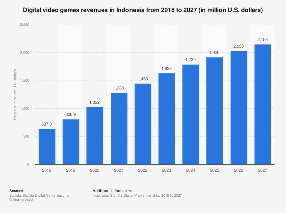 电子游戏产业在印度尼西亚正在蓬勃发展,越来越多的印尼人通过使用游戏机、手机或个人电脑参与游戏活动。虽然这个行业长期以来一直是许多印尼人喜爱的消遣方式,但新冠疫情加速了它的发展。在2019年至2021年期间,就在几次封锁期间,该行业经历了最高的年度收入变化,每年约为25%至28%。预计未来几年,数字视频游戏行业的收入将继续增长,到2027年,收入将超过20亿美元。