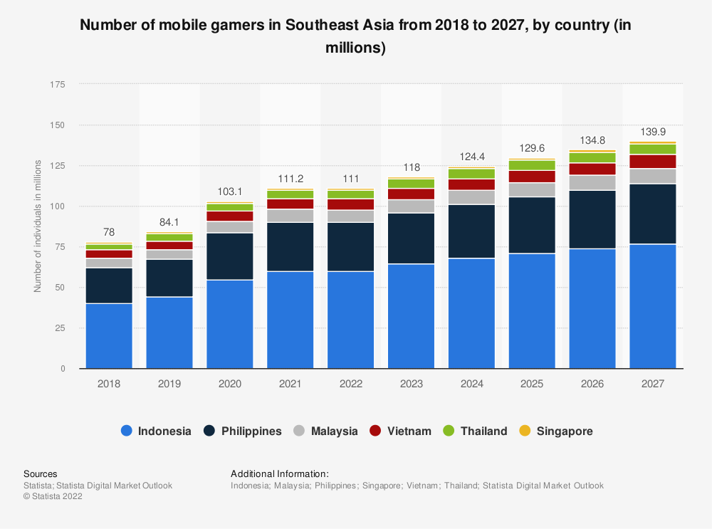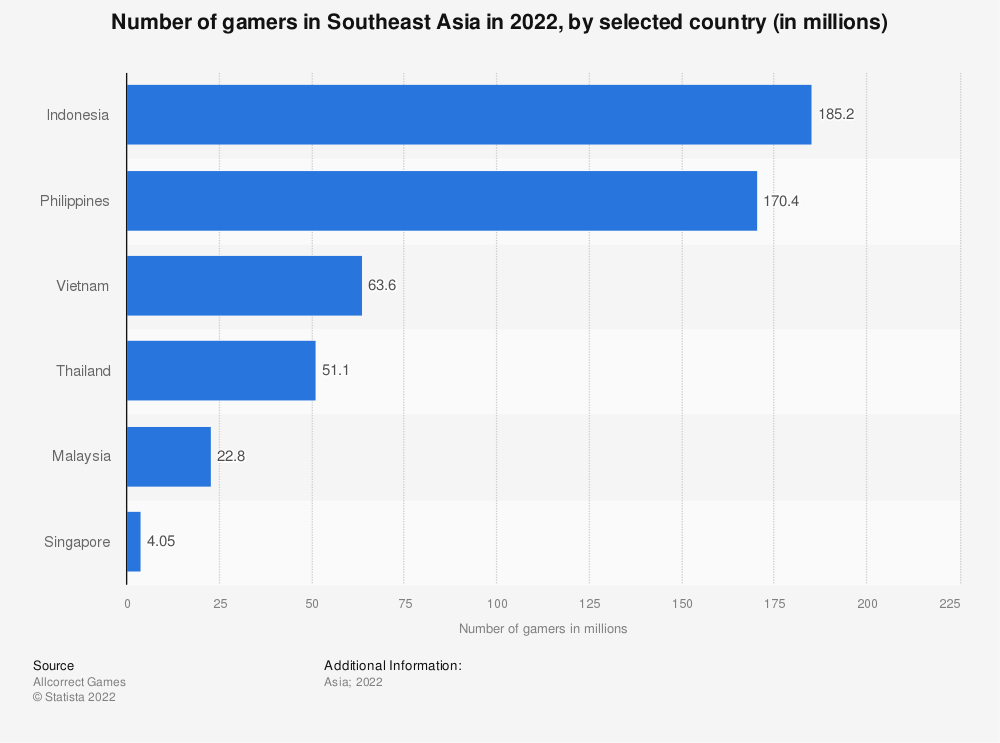 2022年东南亚游戏玩家数量(以百万计) 数据来源:Statista.com