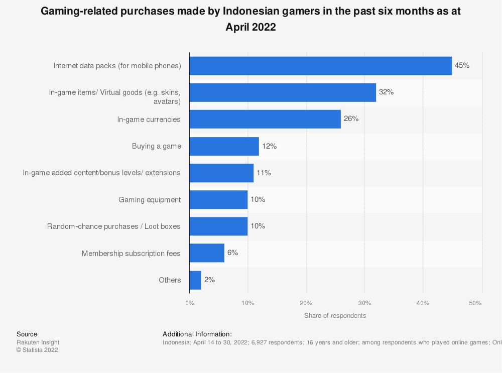 截至2022年4月,印尼游戏玩家在过去六个月内与游戏相关的购买 数据来源:Statista.com