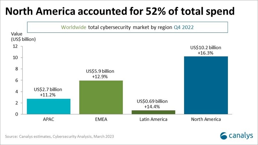 北美在整体网络安全支出方面继续领先,在2022年第四季度增长16.3%,达到102亿美元,占全球市场的一半以上。