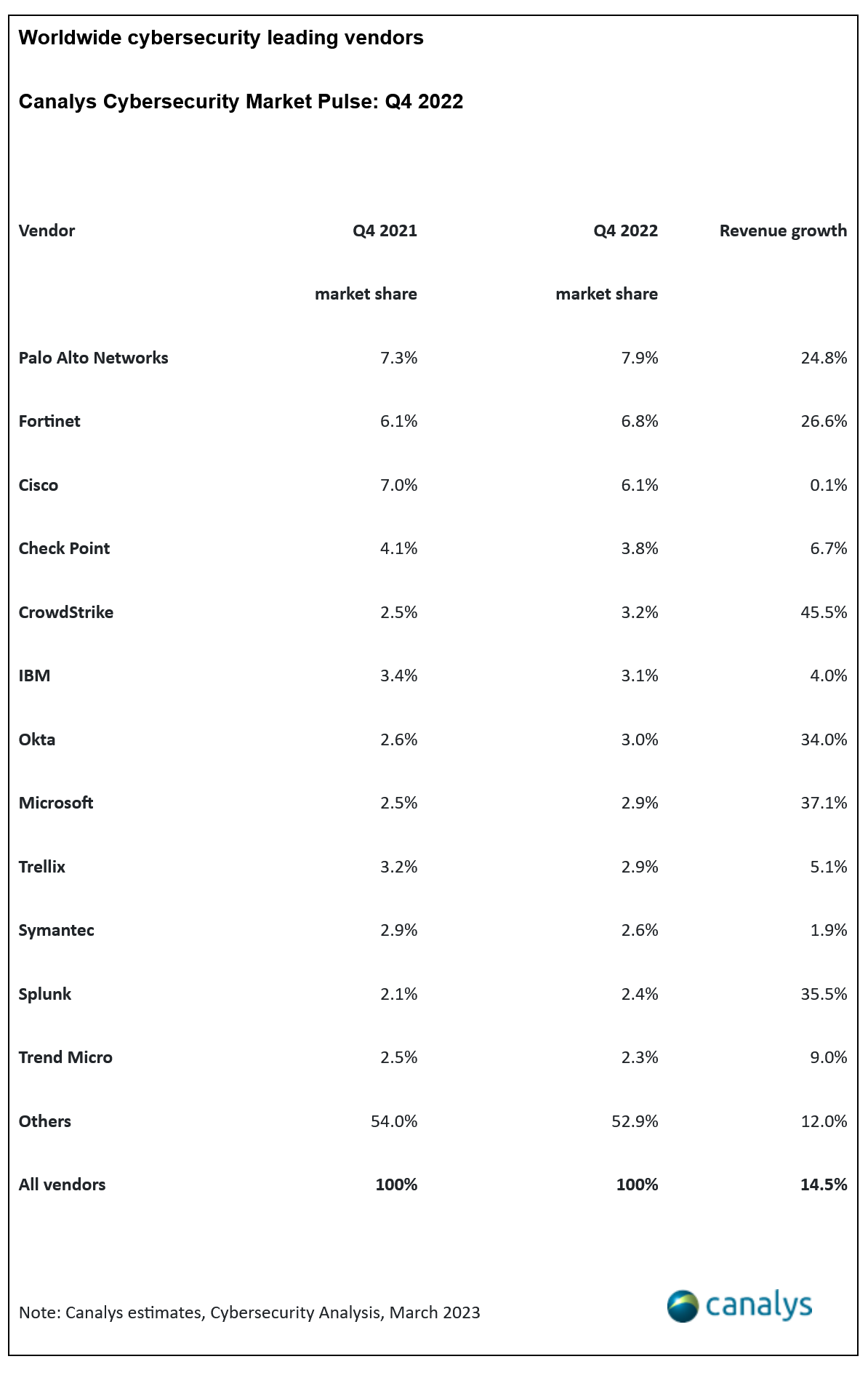 IT预算日益紧张,迫使客户优先考虑项目,而额外的审查进一步延长了销售周期,这抵消了总体乐观的业绩。领先的供应商在高度分散的市场中争夺地位,前12名网络安全供应商在本季度占总支出的47.1%。帕洛阿尔托网络公司在2022年第四季度仍然是领先的供应商。Fortinet在交付了更多中档防火墙积压订单后,领先于思科。Check Point排名第四,但CrowdStrike继续缩小差距。Okta和微软也有所上涨。