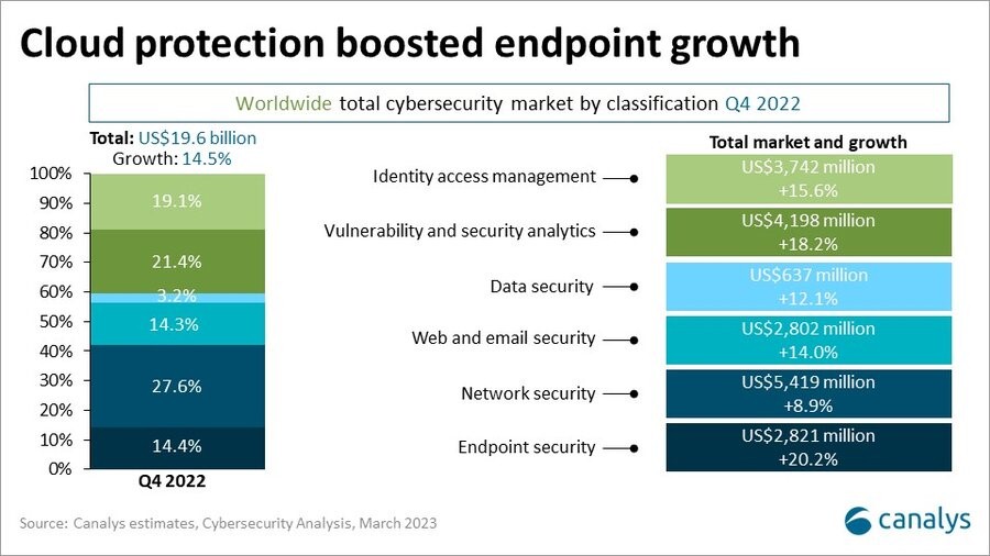 网络安全技术的总支出在2022年第四季度保持强劲,强劲的渠道销售弥补了直接销售的下降。市场增长14.5%,至196亿美元。渠道网络安全技术支出增长16.2%,至180亿美元,占市场总额的91.8%。客户和供应商之间的直接支出占市场的8.2%,下降了1.8%。2022年,网络安全技术支出总额增长15.8%,至711亿美元,而通过渠道的支出增长16.1%,至646亿美元,占整个市场的91.0%。