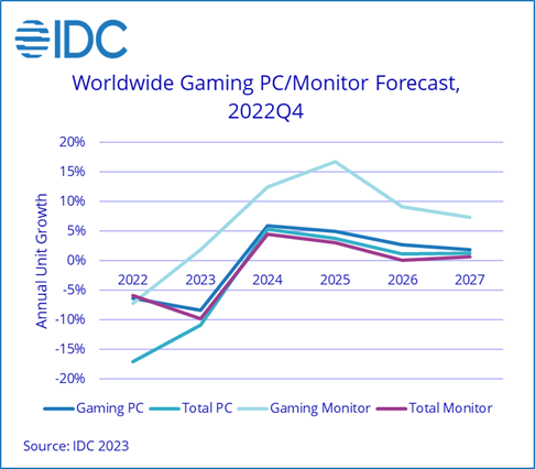 尽管短期内存在负面影响,但游戏PC和显示器市场的表现普遍有望超过整体PC和显示器市场,因为游戏产品的总量将从2023年的5880万台增长到2027年的7510万台。