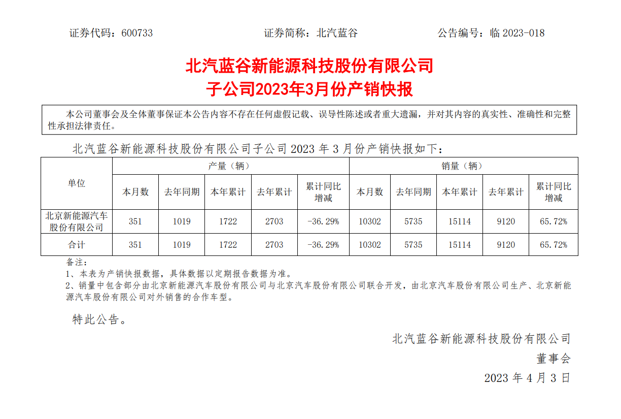 北汽蓝谷今日发布公告,子公司北京新能源汽车股份有限公司 2023 年 3 月份销量 10302 辆;1 至 3 月累计销量 15114 辆,同比增长 65.72%。北汽新能源 1 至 3 月累计产量 1722 辆,同比下滑 36.29%。