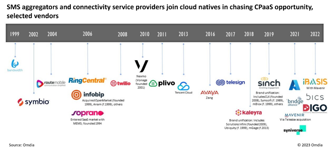 在过去六年,提供CPaaS的供应商数量显著增加,仅在过去两年就有七家公司加入。加入云原生通信提供商(如Twilio、Nexmo、Bandwidth和Plivo)阵营的有短信聚合商、连接服务提供商、商业通信提供商和设备供应商(如Sinch、Infobip、Telesign、BICS、Azure、Mavenir)。