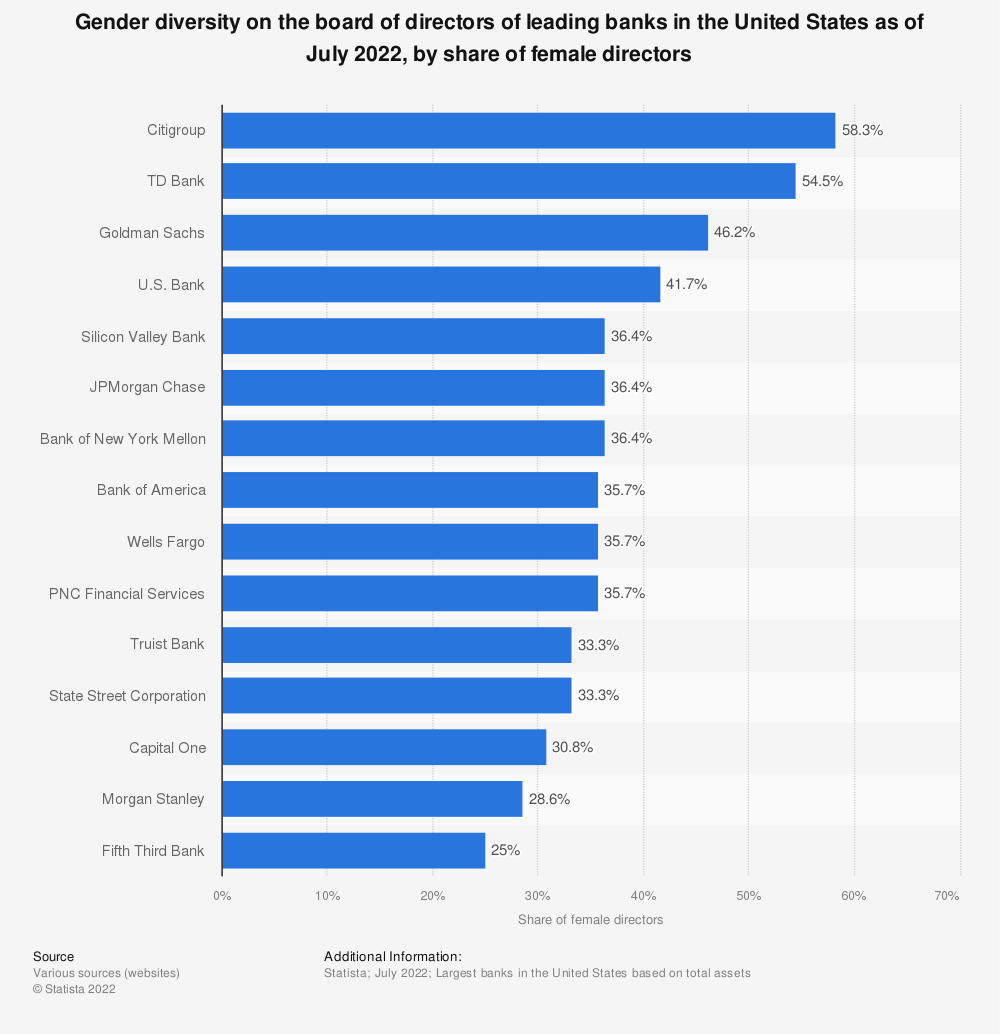 2021年,按女性员工占员工总数的比例计算,该行在美国最大的银行中排名第七。女性董事会成员的比例为36.4%,在美国主要银行的董事会中排名第六。另一方面,该银行在种族多样性方面做得更好,它的少数族裔员工在总员工中所占比例最高,而且在高管和高级员工方面,它也是种族多元化程度最高的五家银行之一。