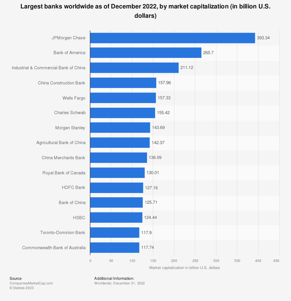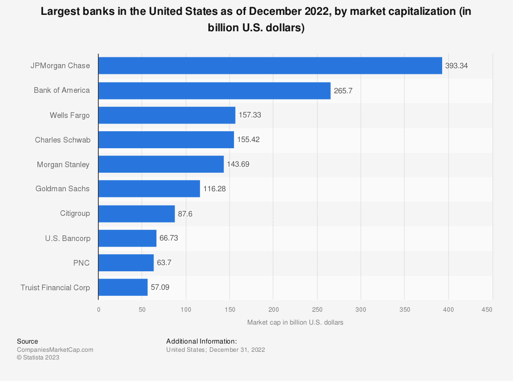截至2022年12月,美国最大的银行,按市值计算(十亿美元) 数据来源:Statista.com