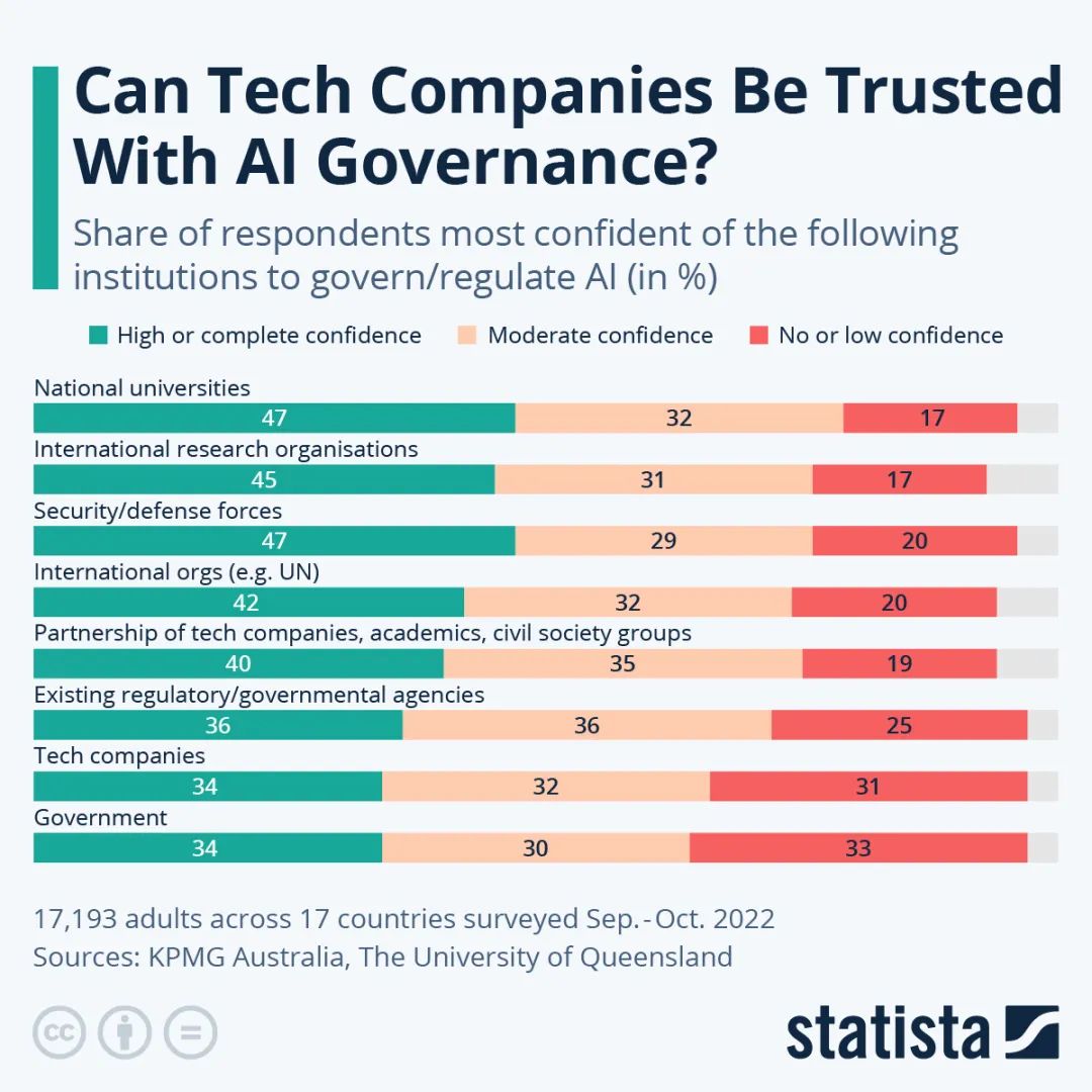该研究对17个国家的1.7万多人进行了调查,发现只有三分之一的受访者对政府在人工智能工具和系统的监管和治理方面具有高度或完全的信心。调查参与者同样对科技公司和现有监管机构作为人工智能的管理机构持怀疑态度。