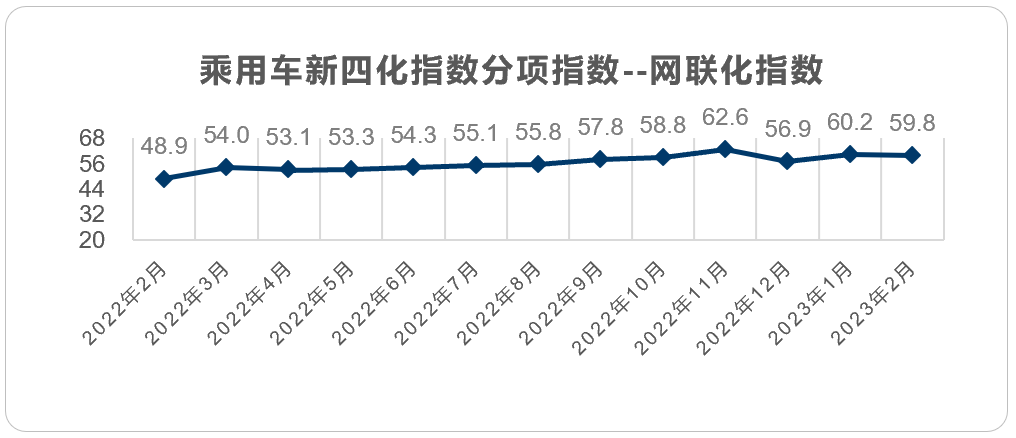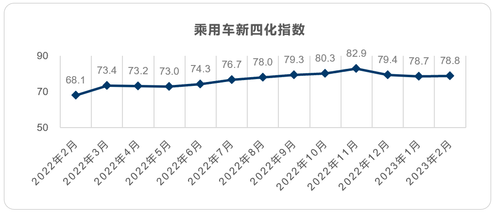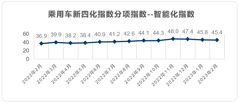 2023年2月乘用车新四化指数为78.8。其中电动化指数为31.6;智能化指数为45.4;网联化指数为59.8。