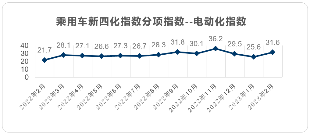 2023年2月电动化指数为31.6,在经历连续2个月的下降后本月显著回升。