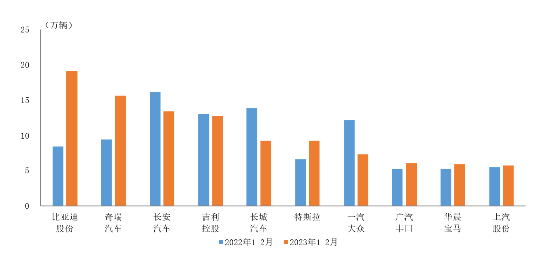 中国汽车工业协会:2023年1-2月前十家SUV生产企业销售情况简析 据中国汽车工业协会统计分析,2023年1-2月,销量排名前十位的SUV生产企业共销售104.3万辆,占SUV销售总量的65.9%。 在上述十家企业中,与上年同期相比,比亚迪股份增速最为显著,奇瑞汽车、特斯拉、广汽丰田和华晨宝马呈两位数增长,上汽股份小幅增长,其他企业呈不同程度下降。 更多阅读:中国汽车工业协会:2022年1-5月前十家SUV生产企业销售情况简析中国汽车工业协会:2023年1-4月前十位SUV生产企业销售情况简析中国汽车工业协会:2022年1-10月前十家SUV生产企业销售情况简析中国汽车工业协会:2022年1月前十位SUV生产企业销售情况简析中国汽车工业协会:2021年1-2月前十家SUV生产企业销售情况简析中国汽车工业协会:2021年5月汽车工业运行情况简述中国汽车工业协会:2023年1-2月我国汽车商品出口金额前十国情况简析中国汽车工业协会:2022年3月前十位轿车品牌销量排名中国汽车工业协会:2022年1-7月前十家SUV生产企业销售情况简析中国汽车工业协会:2024年1-6月前十位MPV生产企业销售情况简析中国汽车工业协会:2024年5月海关进出口情况简析中国汽车工业协会:2023年1-8月前十位轿车生产企业销售情况简析中国汽车工业协会:2023年1-7月七大类汽车商品进出口金额情况中国汽车工业协会:2023年1-7月汽车制造业营业收入保持增长中国汽车工业协会:2023年1-7月前十位汽车生产企业销售情况简析
