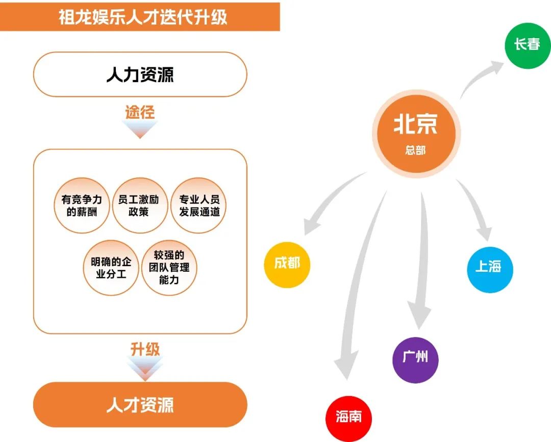 近年来,祖龙娱乐正在通过人才储备和优化管理两条路径进一步巩固其在研发人才上的优势,这将是祖龙娱乐未来研发竞争力发展的重要趋势。一方面,祖龙娱乐不断吸纳高价值人才和潜力人才,并通过较高的薪酬、激励政策和晋升发展通道留住人才,不断发掘员工的潜能,实现由“人力”资源升级为“人才”资源的转化。另一方面,祖龙娱乐在不断扩充研发基地的建设, 在除北京总部外的三大研发基地中,祖龙娱乐上海研发中心的团队建设和架构搭建目前已经取得进展,并有两款在研产品;成都研发基地和长春研发基地实力也正在不断增强。在广纳游戏人才、建设研发基地的同时,祖龙娱乐进一步优化团队管理流程,以游戏工业化为契机,将分布在北京、上海、广州、成都、长春和海南的工作团队进行系统有机的整合,不断优化团队配置,使研发人才发挥出最大的价值。