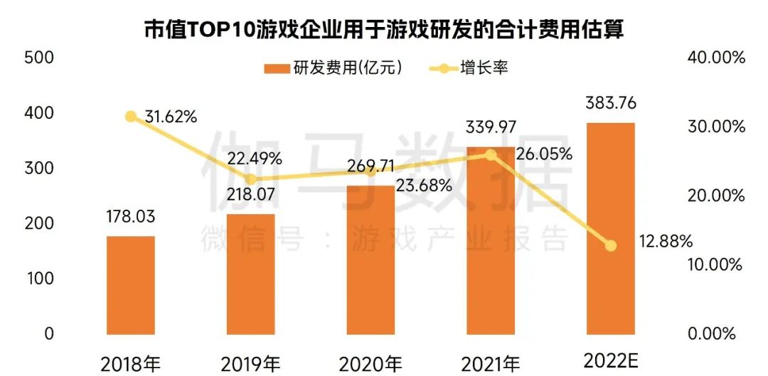 2022年,中国市值TOP10企业游戏研发费用合计预计超过380亿元,连续多年保持高速增长。这说明了虽然2022年游戏市场规模下滑,但头部企业仍然保持了较高的精品研发意愿,游戏企业的研发竞争力将持续提升。