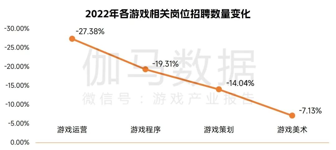 2022年,游戏运营、游戏程序、游戏策划、游戏美术四类岗位的招聘需求均出现下滑。其中,游戏运营岗位数量下降幅度最大,同比减少27.38%,游戏美术岗位数量下降幅度最小,同比减少7.13%。