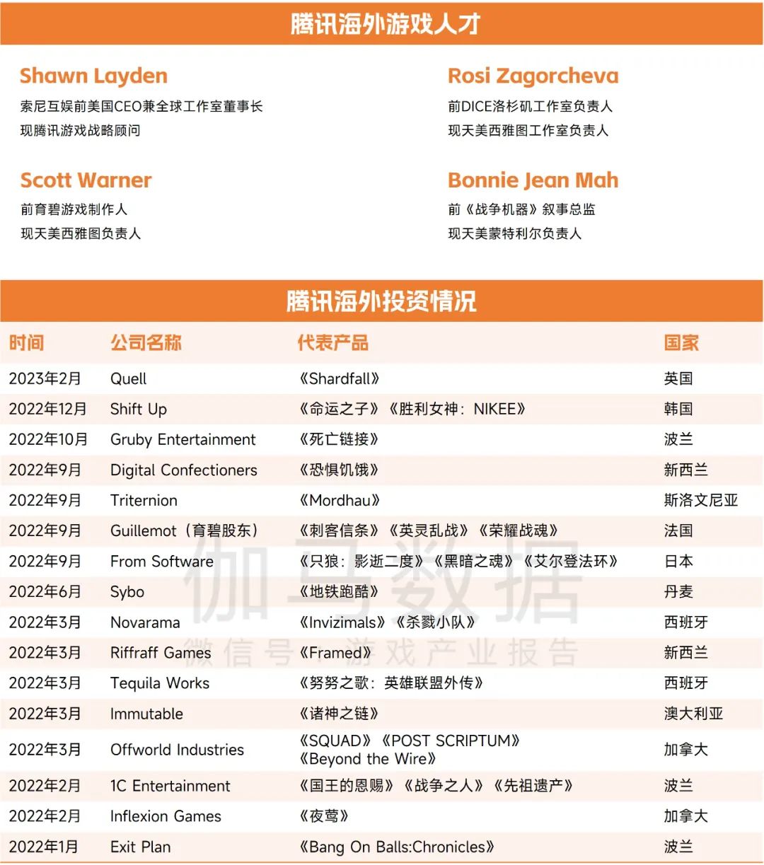 2022年,腾讯在游戏领域的投资重心进一步转向海外。据伽马数据统计,2022年1月—2023年2月期间,腾讯共有19起游戏相关的投资,其中国内市场仅有3起投资,其余16起均投向海外游戏企业。从被投资的企业分析,腾讯既投资了如From Software和育碧等已经拥有成功游戏产品的企业,也投资了一些具备发展潜力的新兴企业,如家庭健身游戏公司Quell。随着海外投资布局的扩大,腾讯投资的企业已经覆盖移动、主机和PC平台,投资企业分布于世界各地,腾讯实现了从中国游戏企业向国际游戏企业的转变。除了直接投资海外企业外,腾讯还广纳全球游戏人才,通过自建海外工作室的方式实现出海。在海外投资和海外人才方面的优势是腾讯研发竞争力的重要体现之一。