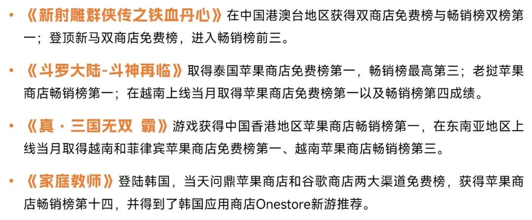中手游持续推动游戏产品的出海,依托东南亚地区为跳板,积累全球化发行经验。《新射雕群侠传之铁血丹心》《斗罗大陆-斗神再临》《真·三国无双 霸》等多款产品已在东南亚地区上线,且在当地市场取得了不错的表现,进入东南亚多国的苹果商店免费榜、畅销榜前列。中手游还对日韩市场和欧美市场进行了探索,并已经取得了成效,例如在韩国市场中,中手游研发的《家庭教师》登顶苹果商店和谷歌商店免费榜,在欧美市场中中手游也有连续12个月流水实现稳定增长的模拟经营游戏《欲望都市》。