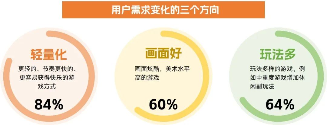 伽马数据的调研结果显示,游戏用户的需求变化主要体现在轻量化、画面好和玩法多三个方面。有84%的受访者认为用户疲劳度升高,更愿意选择更轻的、节奏更快的、更容易获得快乐的游戏方式;有60%的受访者认为用户会选择画面炫酷、美术水平高的游戏;有64%的受访者认为用户需要玩法多样的游戏,例如中重度游戏增加休闲副玩法。
