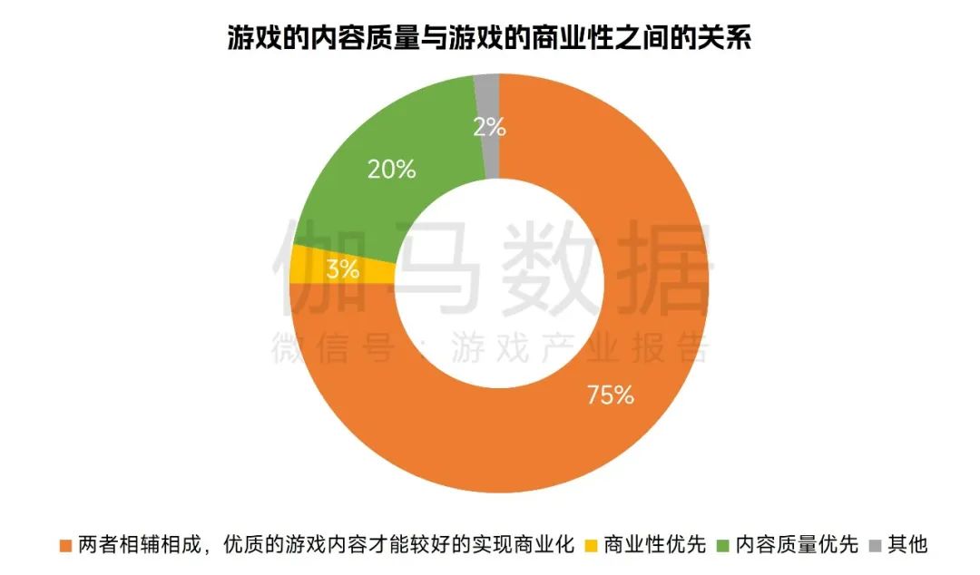 伽马数据的调研结果显示,在游戏内容质量与商业性的问题上,有75%的受访者认为游戏内容质量与游戏的商业性相辅相成,内容质量高的游戏产品才能实现更好的商业化;有20%的受访者认为游戏内容质量优先于商业性。这说明提升内容质量已经成为游戏开发者的共识,将成为从研发端推动游戏精品化进程的动力。