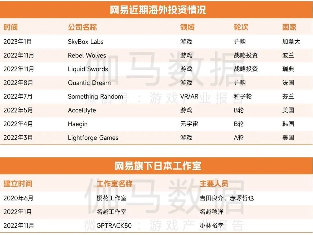 从海外工作室的角度来看,网易在2022年加速吸纳海外知名游戏人才,并以海外知名制作人为核心投资建立海外游戏工作室,提升了游戏产品的制作水平,补充了网易在主机游戏等方面的研发经验。在一年多的时间内,网易在日本分别以名越稔洋(《如龙》系列制作人)、小林裕幸(参与《生化危机》《鬼泣》系列游戏开发)等知名制作人为核心,成立了名越工作室、GPTRACK50工作室,提升了其在海外的研发实力。