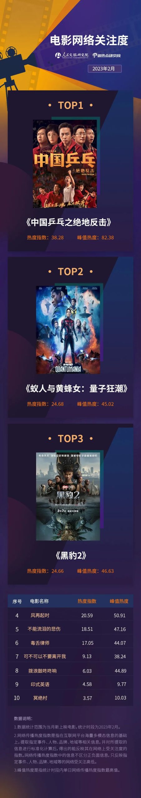 微热点WRD:2023年2月电影网络关注度榜 微热点研究院与人民文旅研究院联合发布《电影网络关注度》(2023年2月)。2023年2月,电影《中国乒乓之绝地反击》热度指数排名第一,为38.28。该电影是由邓超、孙俪、许魏洲、段博文、蔡宜达、丁冠森、孙浠伦、阿如那等演员领衔主演的体育题材电影。1月26日片方宣布该影片小规模放映,后于2月17日再度大规模上映。电影《蚁人与黄蜂女:量子狂潮》以24.68的热度指数位列第二,《黑豹2》以24.66的热度指数排名第三。 更多阅读:微热点WRD:2022年4月电影网络关注度榜微热点WRD:2022年7月电影网络关注度榜微热点WRD:2022年9月电影网络关注度榜灯塔专业版:耗时47天 《独行月球》成中国影史第15部30亿票房作品电资办:2024年10月14日-10月20日全国电影票房周报电资办:2024年9月30日-10月6日全国电影票房周报电资办:204年7月8-14日全国电影票房周报电资办:2024年6月10日-6月16日全国电影票房周报电资办:2024年5月全国电影票房月报猫眼:2024端午档首日票房1.16亿电资办:2023年8月全国电影票房月报电资办:2023年8月28日-9月3日全国电影票房周报电资办:2023年8月21-27日全国电影票房周报电资办:2023年8月14-20日全国电影票房周报电资办:2023年8月7-13日全国电影票房周报