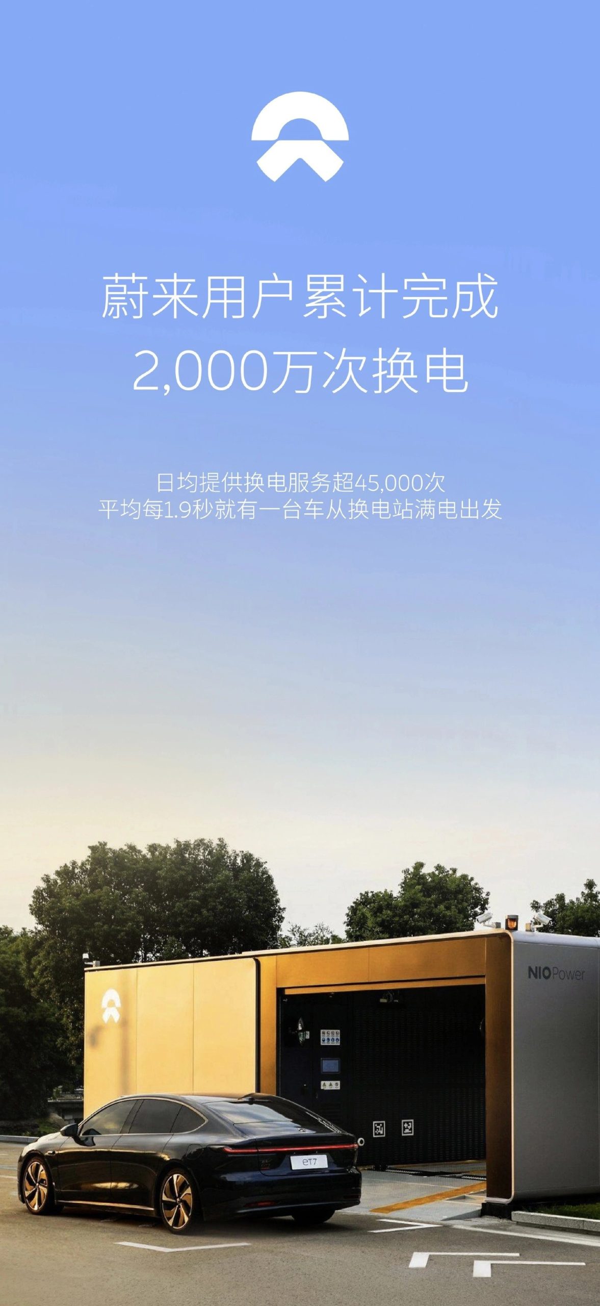 近日消息,蔚来宣布达成第 2,000 万次换电服务的成就。据介绍,蔚来 0-1000 万次换电用了 1506 天,1000 万-2000 万次用时 273 天,换电站日均提供换电服务超 45000 次。