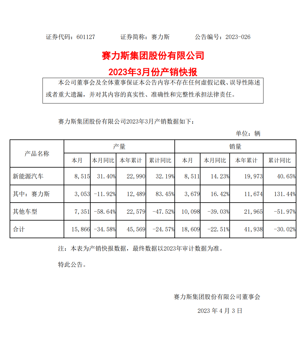 近日消息,赛力斯发布公告,公司 2023 年 3 月新能源汽车销量 8511 辆,同比增长 14.23%;3 月产量达 8015 辆,同比增长 31.40%。