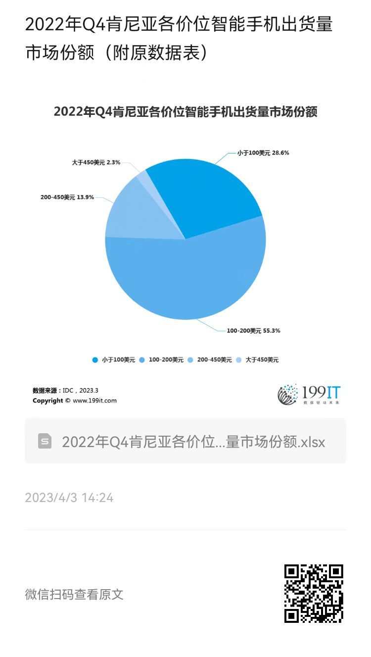 2022年Q4肯尼亚各价位智能手机出货量市场份额(附原数据表) ​​​
