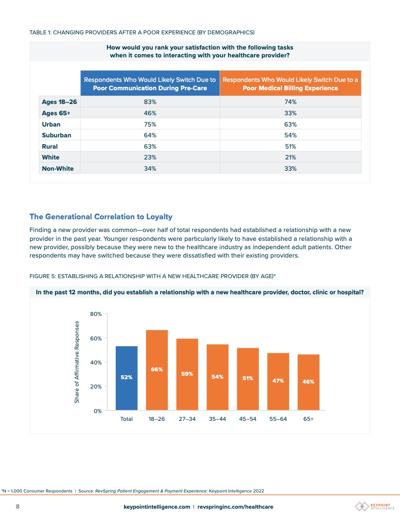 提供者应该注意这一点,因为调查结果表明患者愿意与提供者建立新的关系。约52%的受访者表示,他们在过去12个月内与新的医疗保健提供者、医生、诊所或医院建立了关系。这一数字在18-26岁的人群中最高(66%),他们也远比平均水平更有可能在经历了糟糕的护理体验更换提供者(83%)。