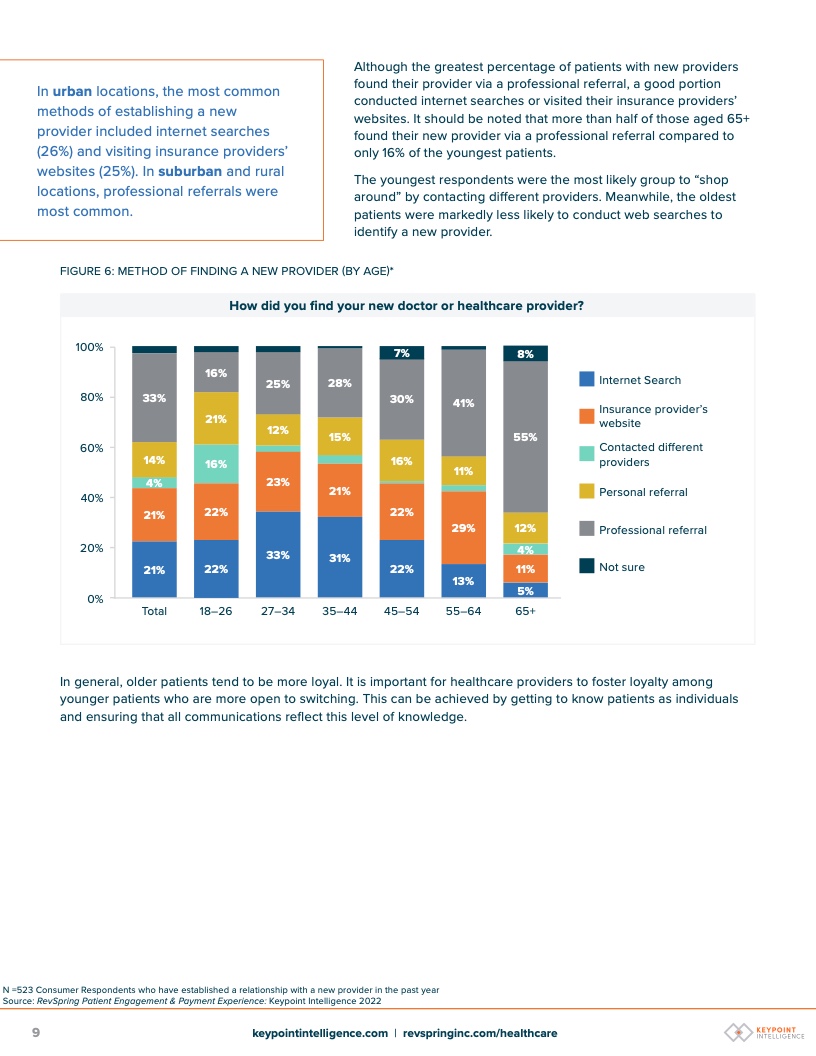 在过去一年中建立了新关系的受访者中,最常见的寻找新医生或医疗服务提供者的方式是通过专业推荐(33%);其次是互联网搜索(21%)和保险提供商网站(21%)。依赖个人推荐的人较少(14%)。值得注意的是,27-34岁年龄段的人最有可能使用互联网搜索来寻找新提供者(33%),其次是35-44岁年龄段的人(31%)。