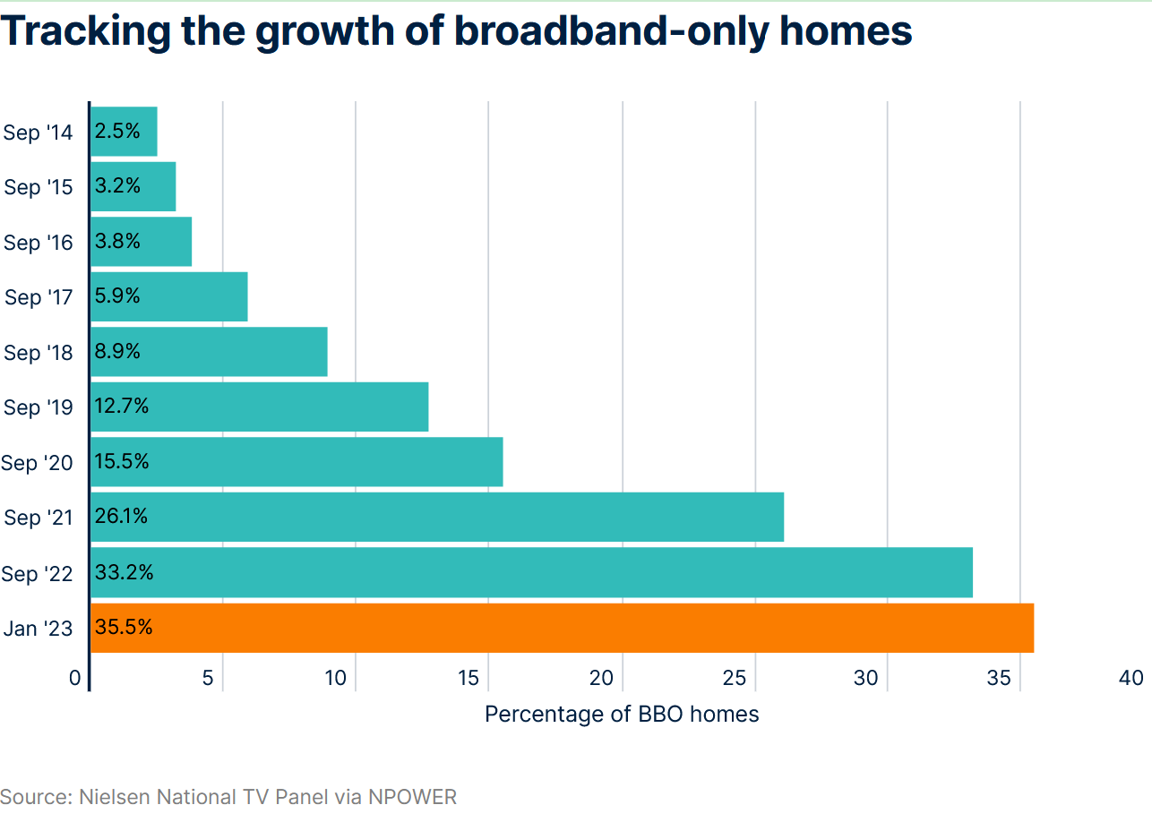 截至2023年1月15日,84.9%的美国家庭至少拥有一台电视联网设备。有些家庭完全放弃有线电视和卫星电视。2022年第三季度,33%的美国家庭仅通过宽带互联网连接收看电视内容。截至2023年1月15日,这一比例已增至35.5%。