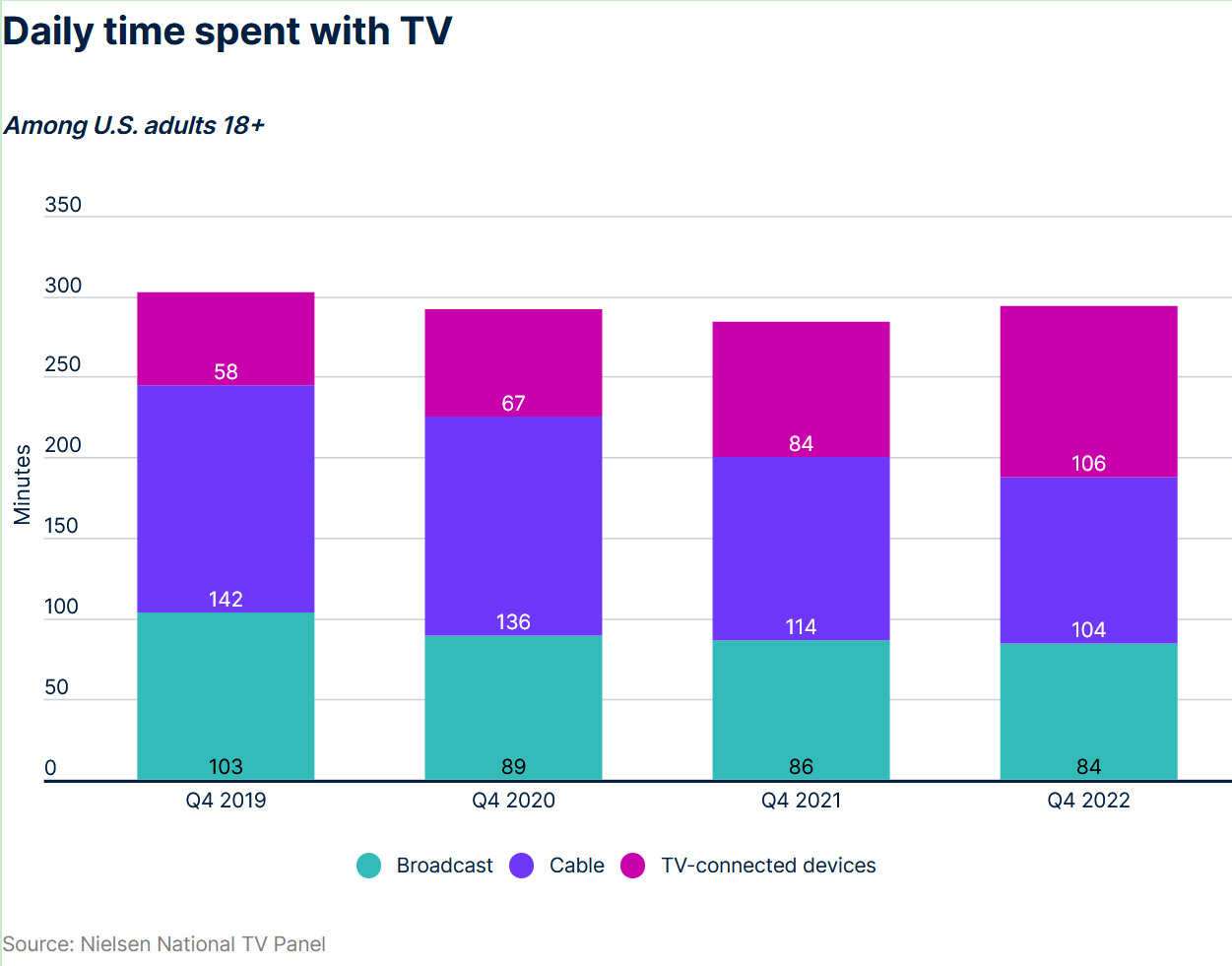 丰富的选择并没有刺激总消费的增长。与2019冠状病毒病导致的电视使用量大幅飙升相比,日常电视使用量早已回落,基本与大流行前持平。然而,随着网络连接的增加,美国人每天看电视的时间显著增加,他们可以通过互联网观看内容。